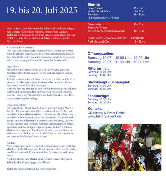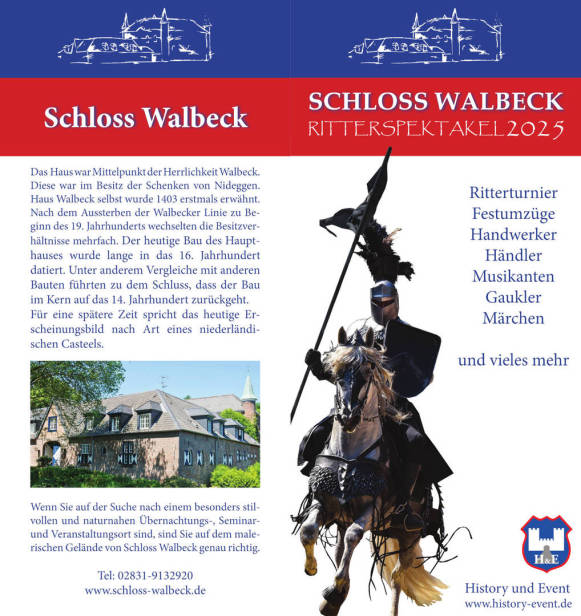 Ritterturnieren. Am 20. Juli und 21. Juli beherbergt das Schloss Walbeck das 5. Ritterspektakel auf den Wiesen des Schlosses.