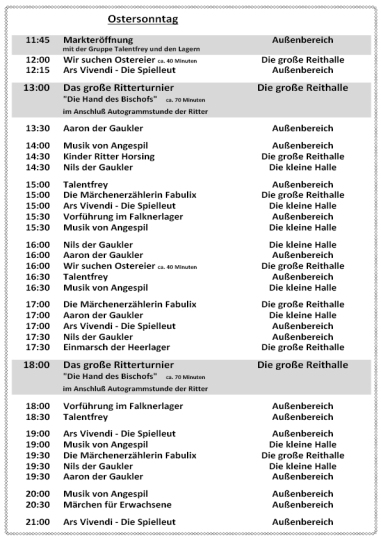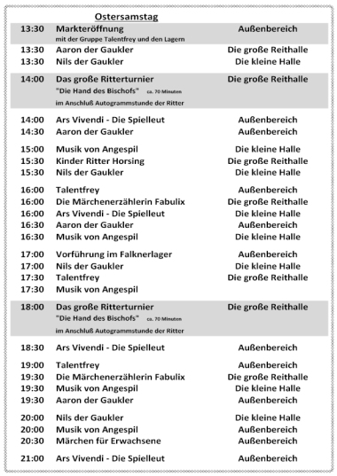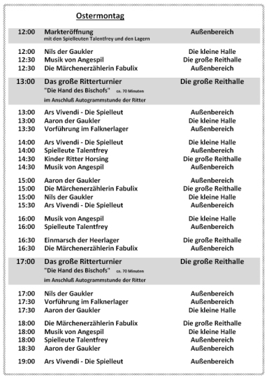 Die Ritterlager haben ihre Lager aufgeschlagen und geben den Besuchern einen Einblick in das Leben dieser Zeit. Gerätschaften, Kleidung, Waffen und Lager werden gerne erklärt und vorgeführt. Das Falknerlager und die Falkner geben zusätzlich Erläuterungen zu den mitgebrachten Vögeln und unterweisen interessierte Besucher in den Umgang mit den Tieren.